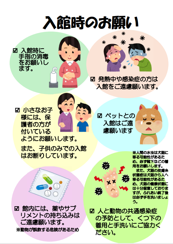 - 発熱中や感染症の方は入館を御遠慮願います。