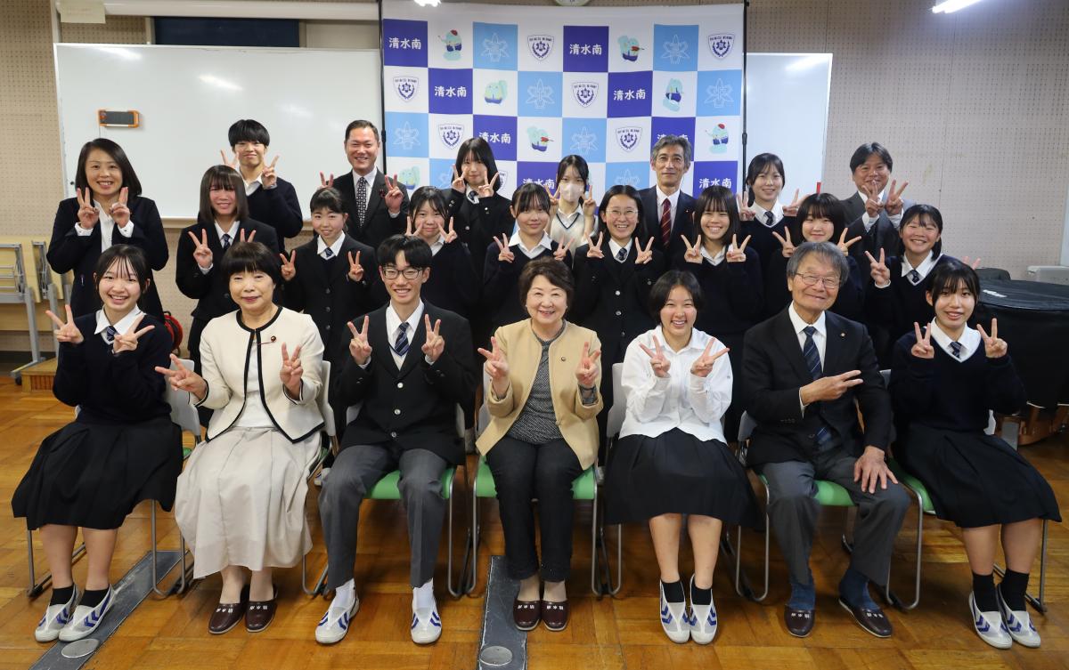 議会からは、山根田鶴子議長と、議員6名が、高校からは、生徒会の1~2年生16名が参加しました。