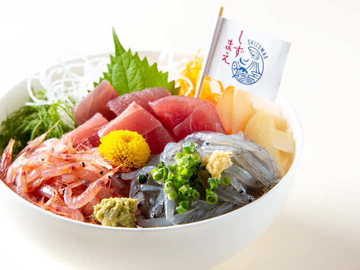 「清水港」は冷凍マグロの水揚げ量日本一。世界中から様々な種類のマグロが集まります。駿河湾で獲れた魚ではありませんが、しずまえの港で水揚げされることから、マグロも「しずまえ鮮魚」の仲間です。「河岸の市(かしのいち)」と呼ばれる近隣市場では、赤身やトロのほか、目玉やカマ、ホホ肉、頭肉などの希少部位が揃い、マグロを存分に楽しめます。
