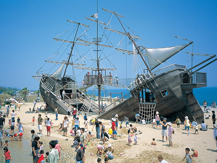 街中に近いエリアでは、用宗海岸海水浴場(駿河区)、三保内浜海水浴場の2か所の海水浴場があり、夏は海水浴やSUP、ヨットなどのマリンスポーツを楽しむ人で賑わいます。広野海岸公園(駿河区)は、難破船を模した遊具が子供たちに大人気。公園の地面は砂浜になっており、ビーチ気分も味わえます。