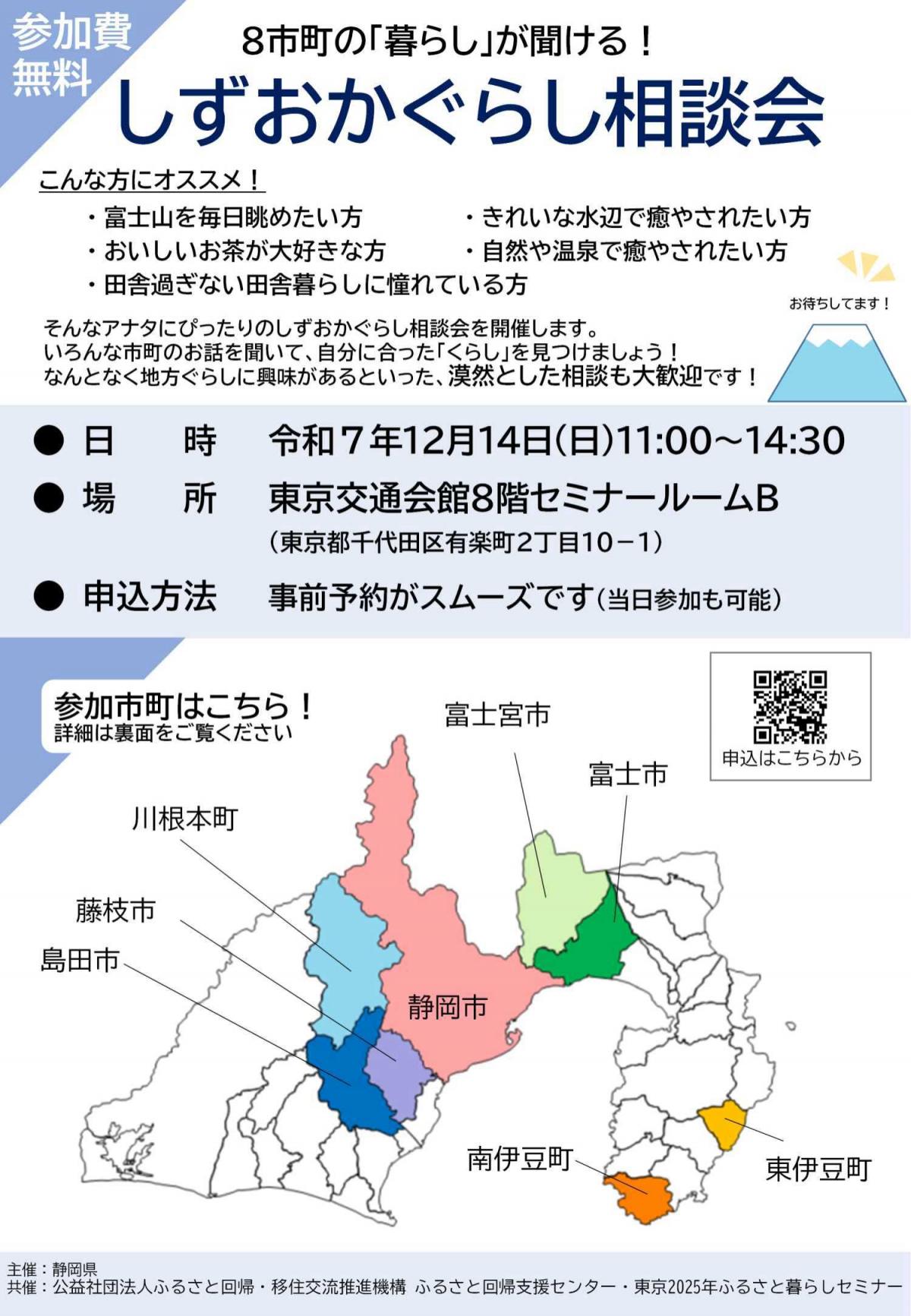 静岡市トップページ > くらし・手続き > 静岡市の移住支援情報 > お知らせ > 2025年 > 【12月14日(日曜日)】県内8市町集合!「しずおか暮らし相談会」