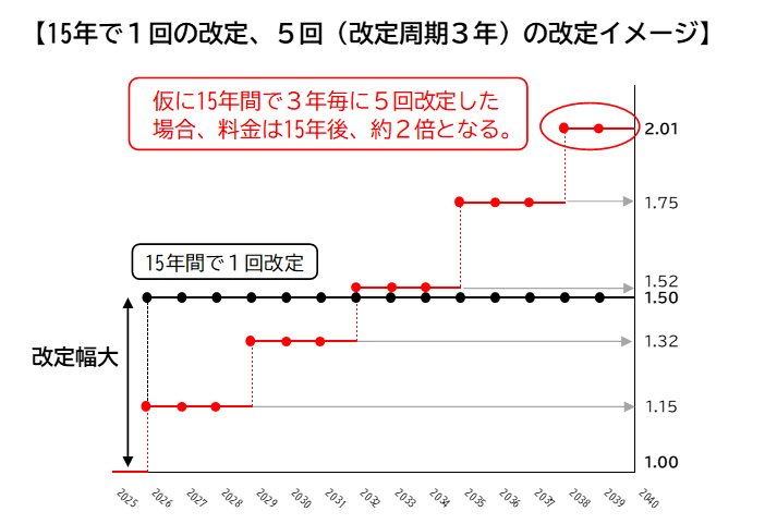 - 他の周期(4、5年)よりも1回の改定率が低いことにより、利用者の改定1回あたりの負担を小さくすることができます。