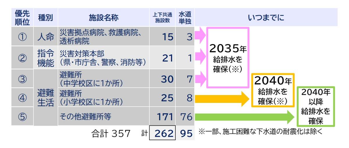 - 2035年までに、災害拠点病院、災害対策本部、中学校区に1か所の避難所(給水拠点)にて給排水ができる状態