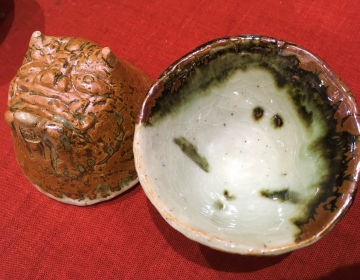 賤機焼で有名なのが、「鬼福(おにふく)」と呼ばれる造形です。徳川家康は、三方ヶ原の戦いにおいて、武田信玄の大軍に浜松城を囲まれた際、城門を開いて太鼓を鳴らし「鬼は外、福は内」と騒ぐという、突拍子もない揺動作戦で無事生還したと伝わっています。合戦後、太田七郎右衛門がこの話にあやかって、外は鬼瓦の形、内は福面を描いた盃を献上すると、家康はとても喜び、賤機焼の称号を与えたと言われています。