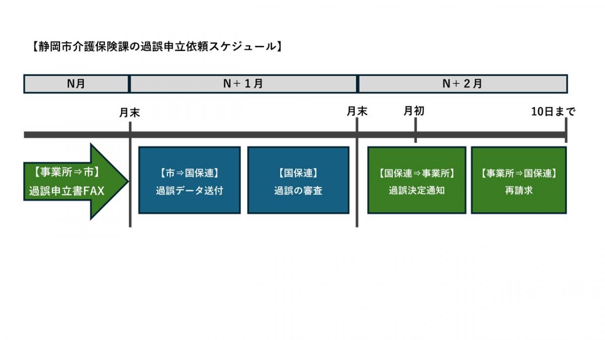静岡市では、毎月末を過誤申立依頼書の提出期限としています。月末までに提出が確認できたものについて、翌月に国保連へデータを送付し国保連で審査され、その後審査を通った場合には国保連から「過誤決定通知書」が届きます。その通知書をもって再請求が可能になります。