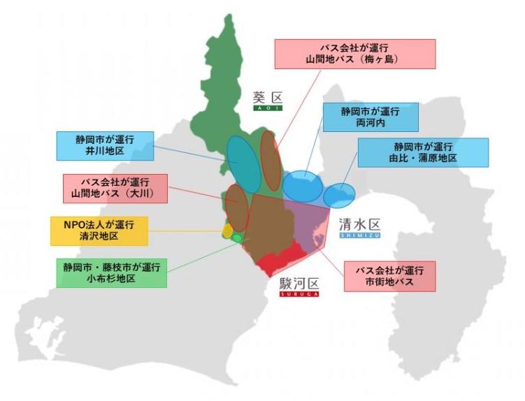 バス会社、NPO法人等による路線バスが提供されない地域については、静岡市が運営主体となって自主運行バスを運行しています。現在静岡市では、葵区井川地区、清水区両河内地区、清水区由比地区、清水区蒲原地区において、4路線を運行しています。