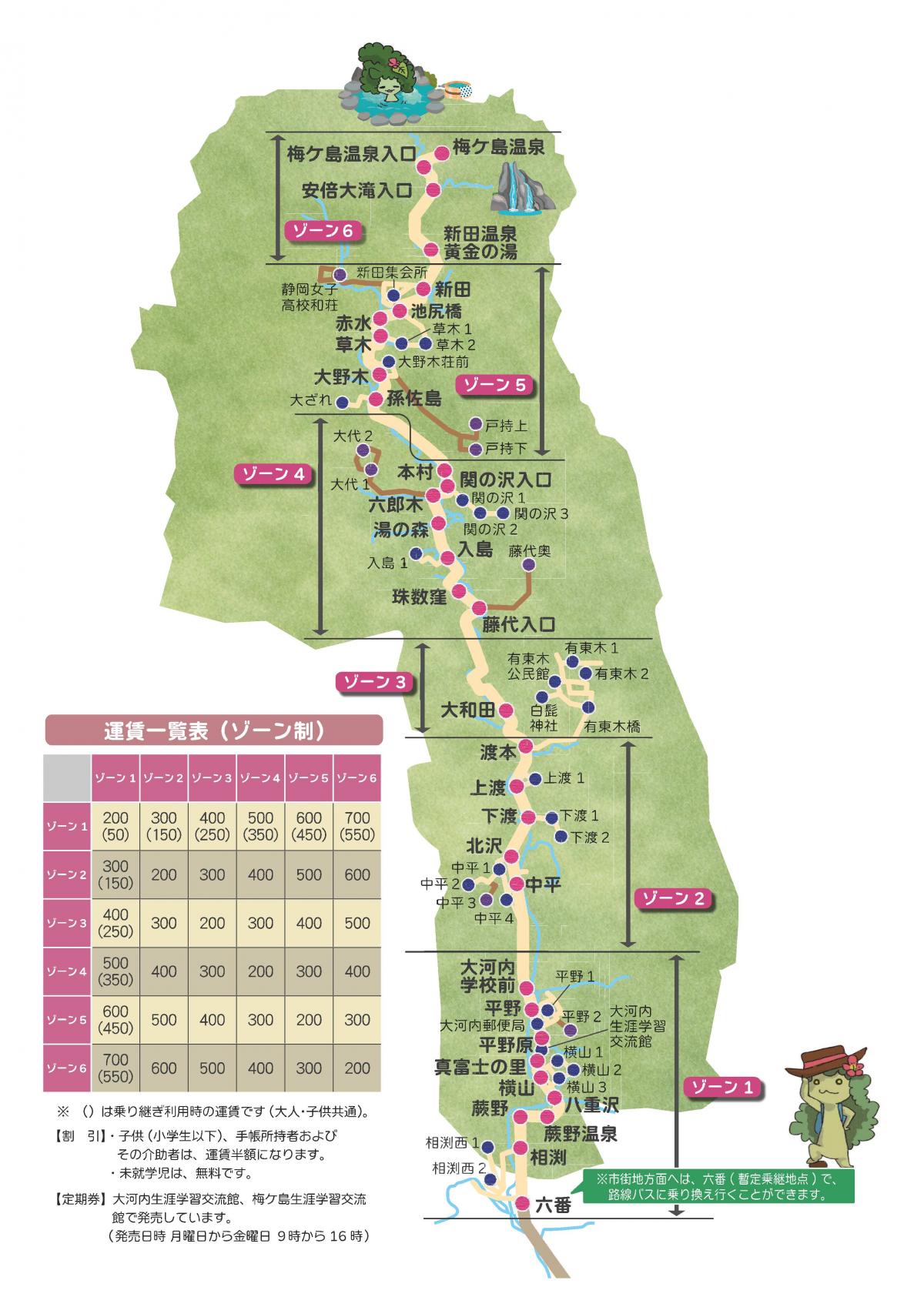 - 路線バスとの乗り継ぎで「六番」~「梅ケ島温泉」などゾーン6の停留所との移動は350円