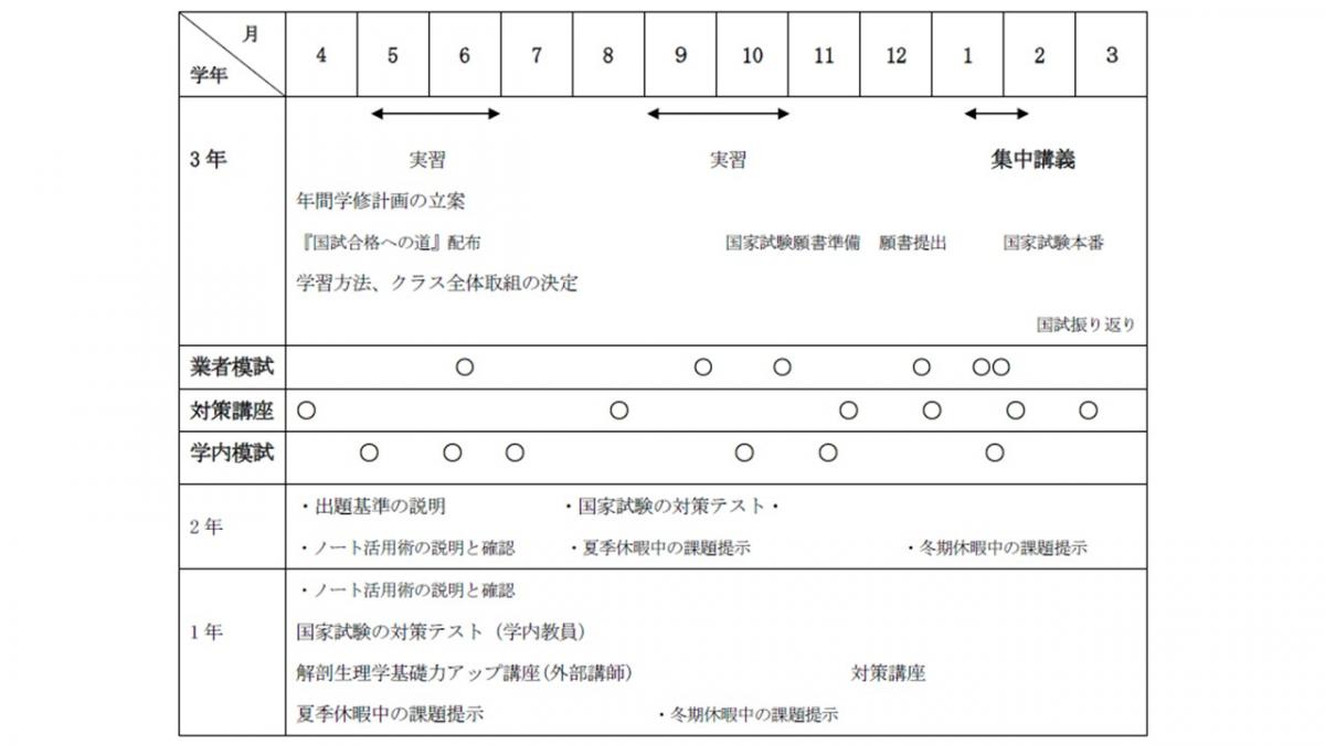 - 4月の時点で1・2・3年各クラスで国家試験対策委員選出。教員も国家試験対策担当を決定します