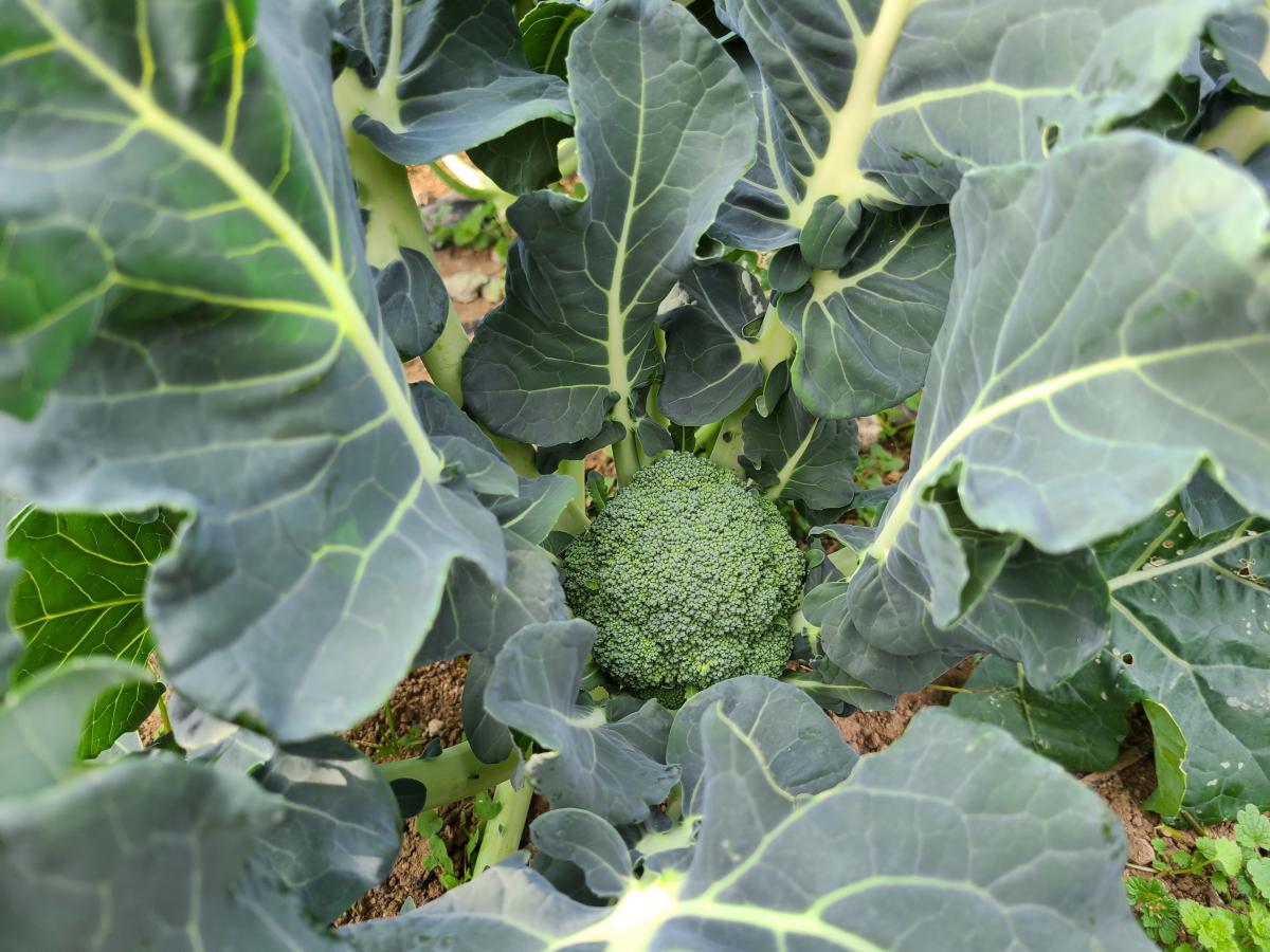 ブロッコリーと紫カリフラワーは、花蕾(つぼみの部分)ができ始めました。紫カリフラワーは、葉をめくると鮮やかな紫色の花蕾が見えます。