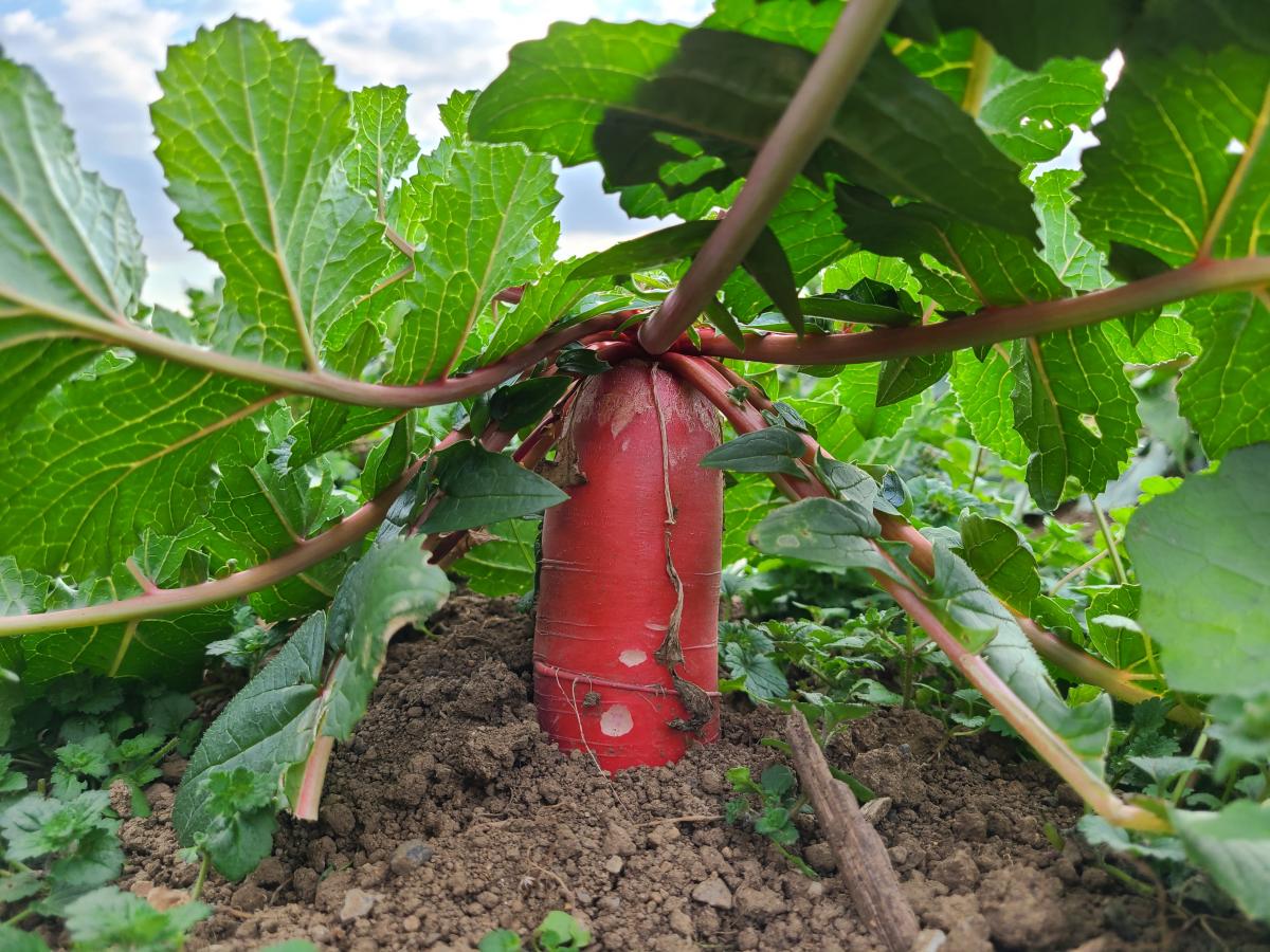 ミニダイコン「天安紅心」(丸い形で中が赤色)もそろそろ収穫適期の予定でしたが、まだ成長が足りないため、もう少しお待ちください。ミニダイコンの畝は雑草がかなり生えていますので、雑草に栄養を取られないよう、株周辺はこまめに除草をお願いします。