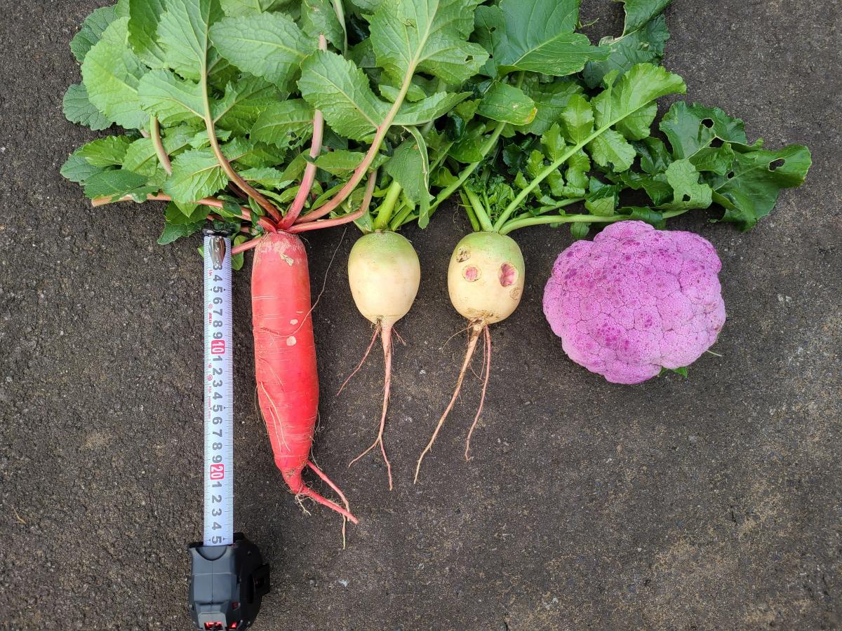 どちらの種類も収穫できるものが多いです。紅化粧は長さ20cm程度、天安紅心2号は直径7cm程度が収穫の目安です。