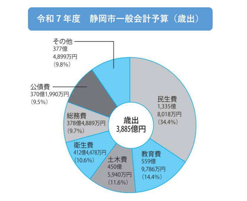 静岡市の歳出のうち、一番多い使いみちは民生費で、高齢者や児童、障害者などの社会福祉のために使われています。