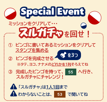 - 一列そろったら、会場内の55番ブース「スルガチャ」の受付に完成したビンゴをもっていく