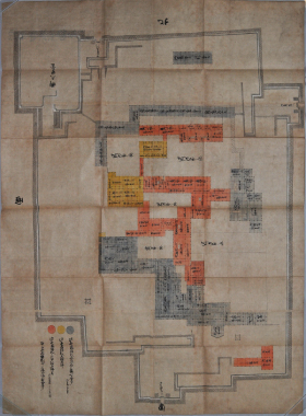 本丸御殿の指図(設計図)「駿府御城并御座鋪図」 絵図が作られた年代は不明ですが、駿府城の本丸内にあった御殿(家康やその後の城主が居住した館)を表した絵図です。家康に謁見するために様々な人々がこの御殿を訪れていました。 |