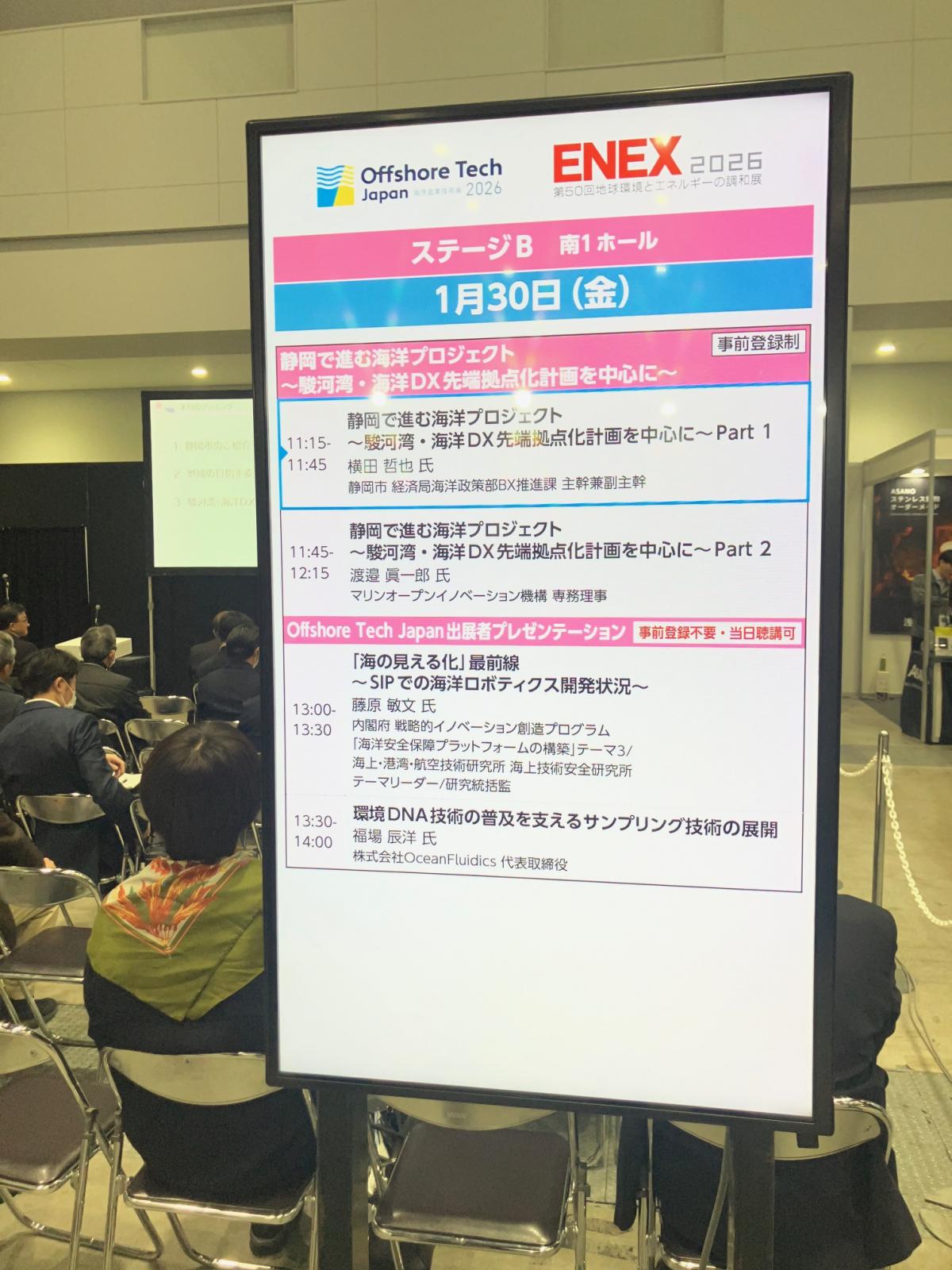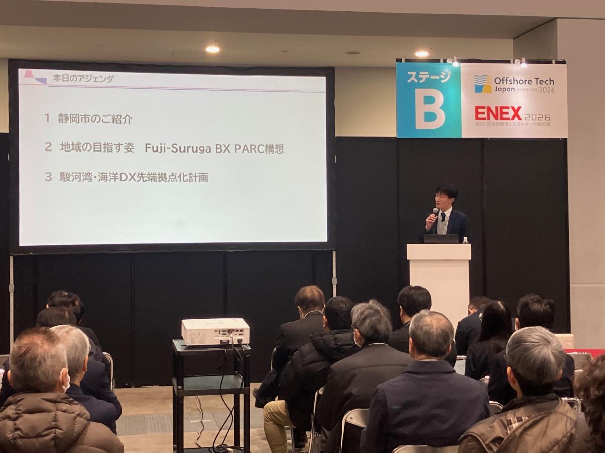 東京ビッグサイトで開催されたOffshore Tech Japan2026展示会に静岡市・静岡理工科大学/一般財団法人マリンオープンイノベーション機構/静岡商工会議所新産業開発振興機構の合同ブースを出展し、駿河湾海洋DXプロジェクトの情報発信を行いました。また、会場内の特設ステージにて、プロジェクトのプレゼンテーションを実施しました。