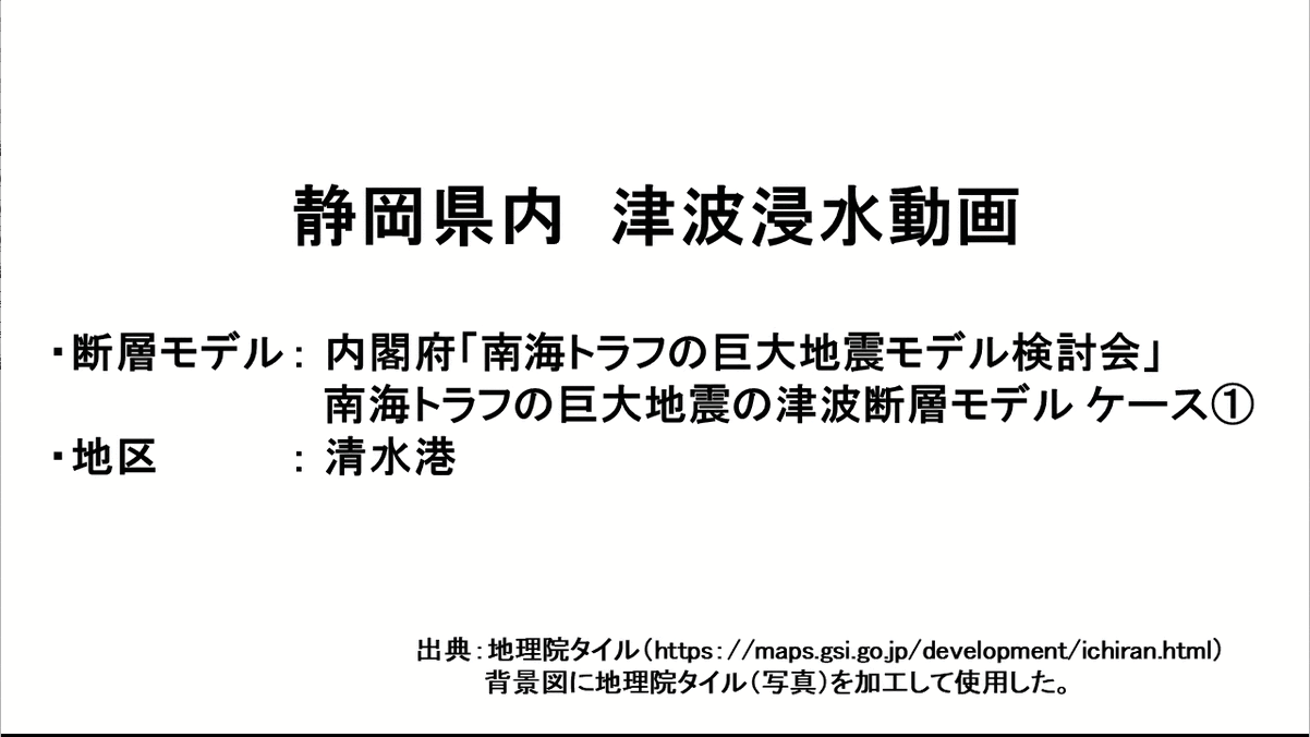 - 静岡県内津波浸水動画 断層モデル:内閣府「南海トラフの巨大地震モデル検討会」南海トラフの巨大地震の津波断層モデルケース①(GIF:9,076KB)