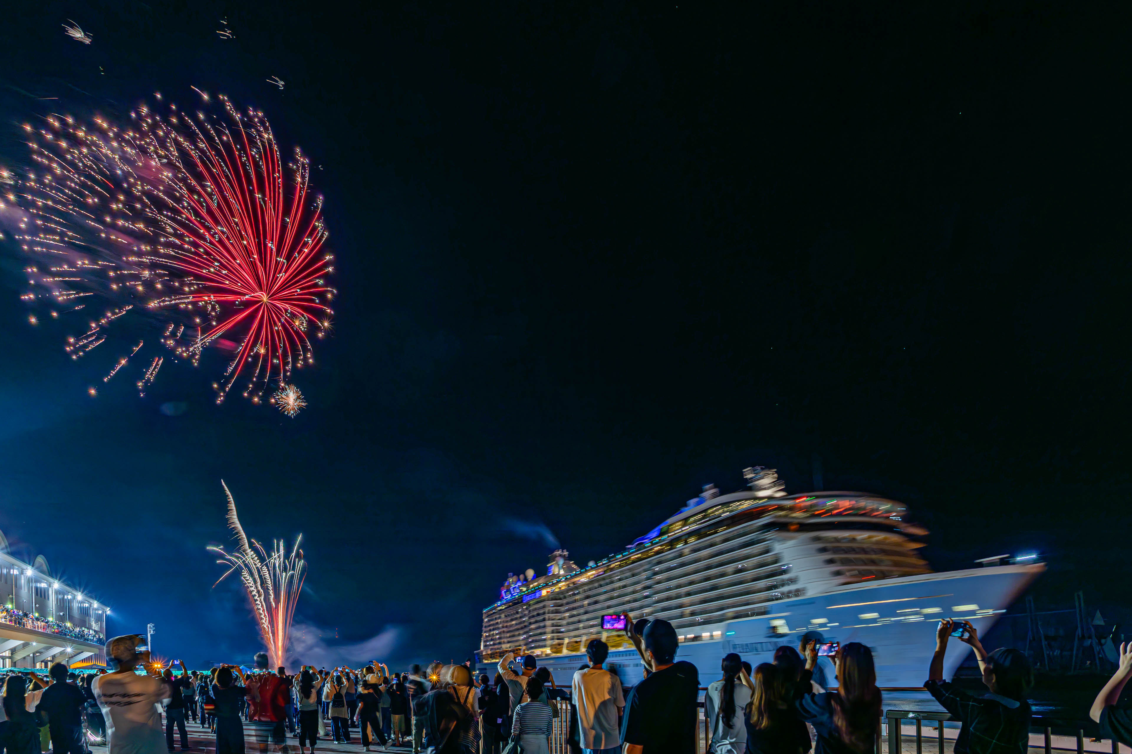 出港時も多くの市民らでにぎわい、乗客と送り出す市民の双方が精いっぱいスマホのライトを振って別れを惜しみました。「ありがとう、また来てね」の声に送られ、打上げ花火と共に出港していきました。きっと思い出深い清水でのひと時になったことでしょう。