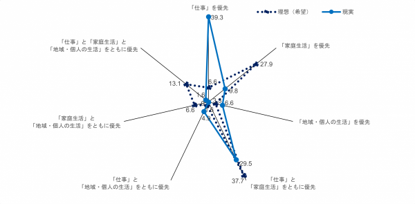 一方、同調査によると、男性の理想の生活では、「仕事と家庭生活をともに優先」が最も多く、次いで「家庭生活を優先」が多くなっています。