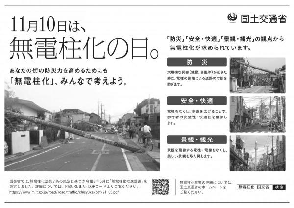 平成28(2016)年12月に成立した「無電柱化の推進に関する法律」では、国民の間に広く無電柱化の重要性についての理解と関心を深めるようにするため、11月10日を「無電柱化の日」と定めています。