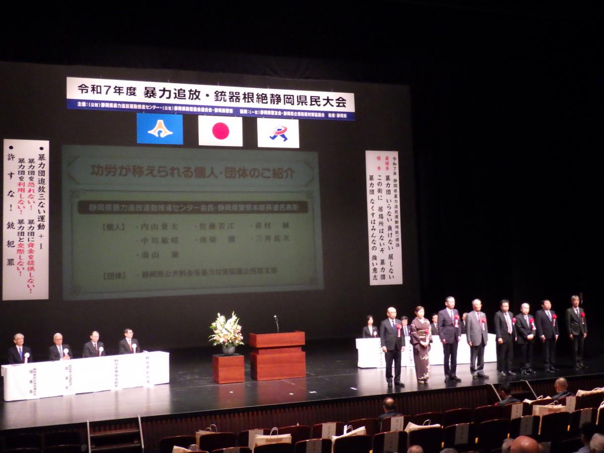 大会第1部では、暴力追放活動に功労のあった個人や団体への表彰にはじまり、主催者あいさつや来賓祝辞を行ったあと、「暴力団と銃器犯罪のない安全で住みよい静岡県」の実現を柱とする大会宣言が全会一致で採択されました。