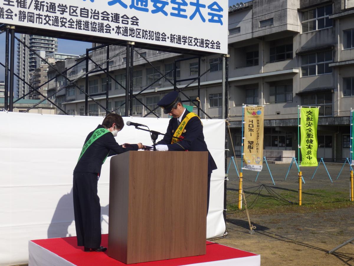 大会は、新通学区自治会連合会長の呼びかけに始まり、元新通学区連合婦人会会長から暴力追放や交通安全を誓った大会決議が、静岡中央警察署長に提出されました。