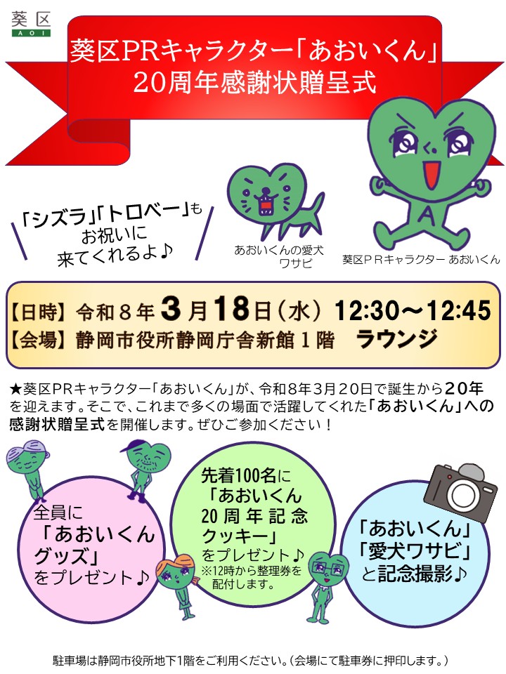 葵区PRキャラクター「あおいくん」が、2026年3月20日(金曜日)で生誕20年を迎えます。