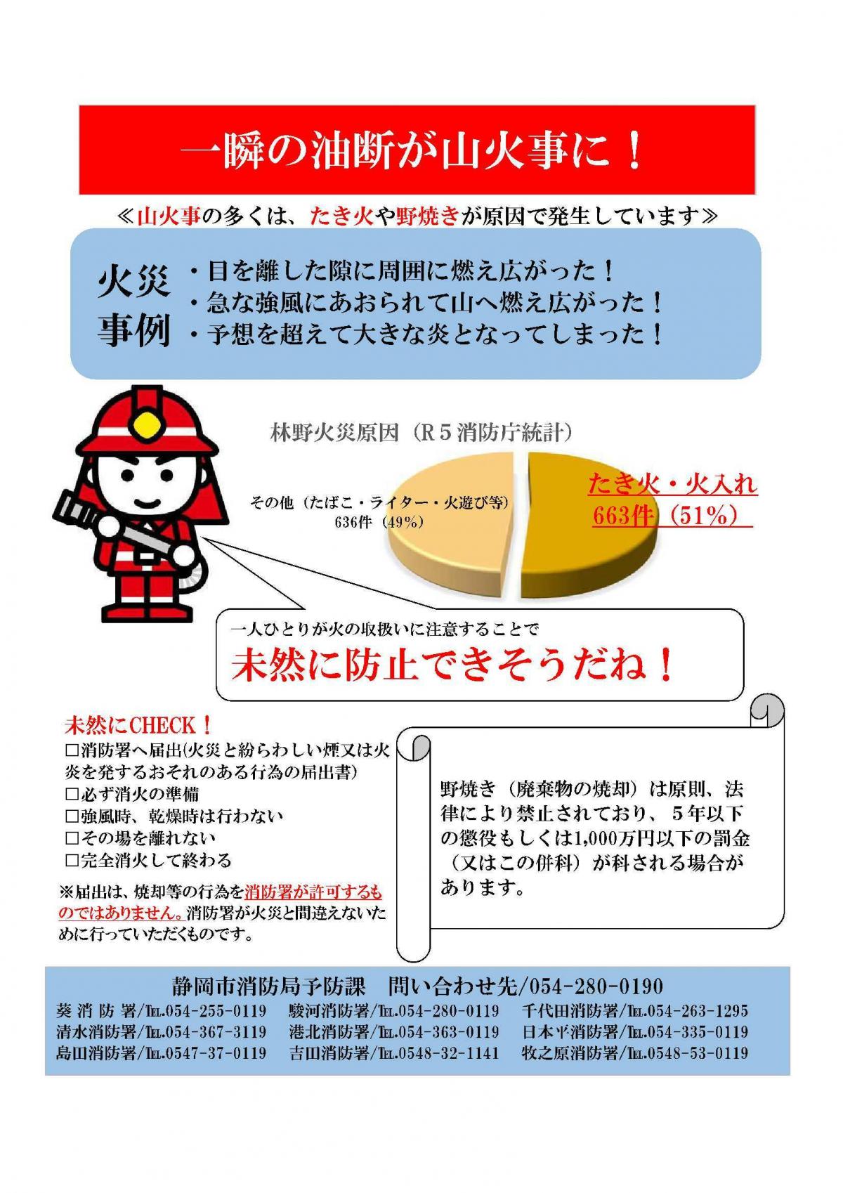 林野火災の主な原因は、たき火、野焼き、たばこ、放火(疑いを含む)等の人的要因によるものが多いです。そのため、一人ひとりの注意で山火事を防ぐことが大切です。